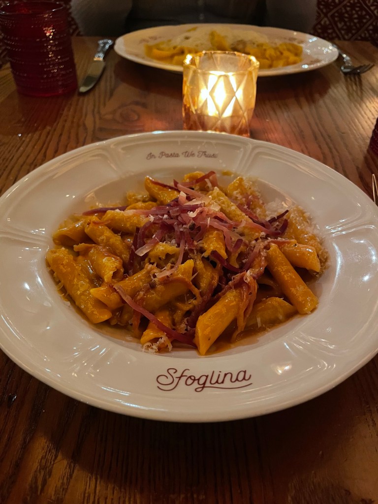 Sfoglina is intentially supposed to be more casual, less fancy and place emphasis on the pasta. While emphasis at this establishment certainly is on the pastas, we felt that the while the interior may have been more casual than other places such as L’Ardente that we visited, it still felt classy and reflected some elegance. We went to the Downtown location and were able to snag an 8pm reservation, which was the only indoor res for Saturday evening we could find. For this review, I want to start by talking about the ambiance of this place: I thought it was beautiful. That’s it, beautiful. We absolutely loved the interior of the restaurant with its dimly lit appearance as well as the warm whites and reds, not to mention their gorgeous bar. The dining room isn’t huge but we found that it was a mastery of blending elegance and welcoming /cozy into one.