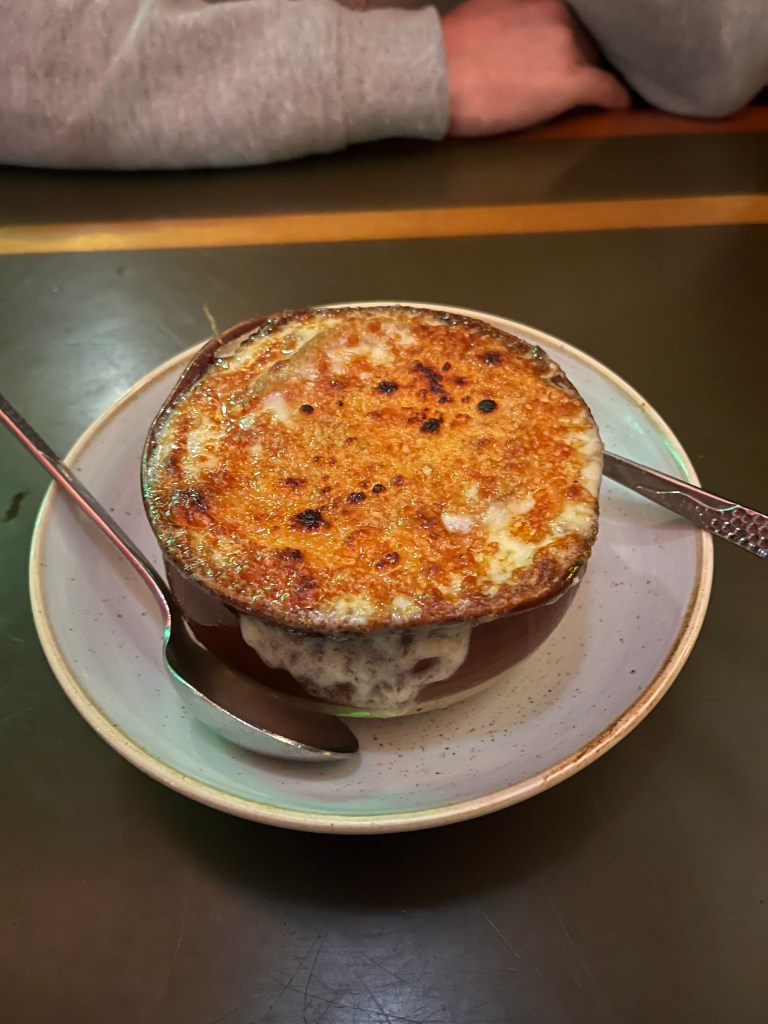 Our server came over to us shortly after we were seated and we ordered appetizers. This time for appetizers, we switched it up and decided to try two of Martin’s soups, their clam chowder and the highly regarded French onion. We found both to be good, the French onion was excellent as it was topped with melted provolone cheese and a baguette. The mild flavor of the provolone was a great compliment to the saltiness of the broth. As for our main courses, we wanted to go with some timeless classics so we ordered a meatloaf and fish and chips, although I was extremely tempted to order the double cut lamb chop. The fish and chips and meatloaf came out soon after we placed our orders. All of the food came out quickly from the appetizers and entrees to the desert, too. Martin’s meatloaf was served with garlic mashed potatoes and broccoli but it was unique in that it was topped with a mushroom gravy. However, the earthiness of the mushrooms interacted well with the rich and dense mashed potatoes. The fish and chips was also somewhat unique. It was dredged and fried as opposed to being traditionally beer battered. The fries were just how I liked them, thin and crispy and the house made remoulade was an excellent compliment to the cod. Before we left, we made sure to order the signature bread pudding. We had a tremendous time at Martin’s and will definitely keep it in the rotation as a tremendous option for a date night, place to take parents, and a place to enjoy a great meal. 8.5/10.